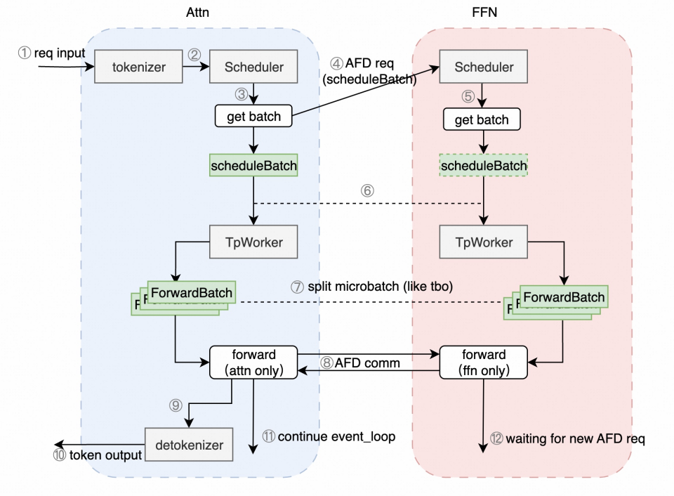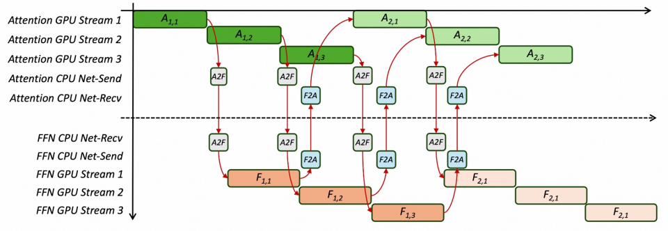 进入近一年,为了进一步挖掘模型不同阶段、不同算子的计算特性,提升整体系统效率,AF(Attention / FFN)分离 开始成为新的演进方向。通过更细粒度地解耦模型计算路径,系统能够在调度、并行和资源分配层面获得更高的灵活性。